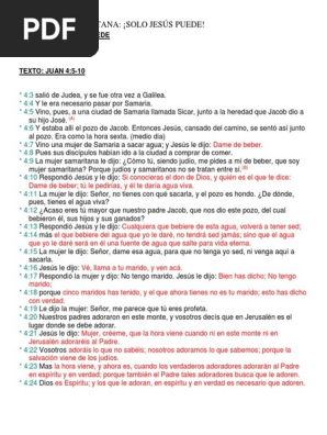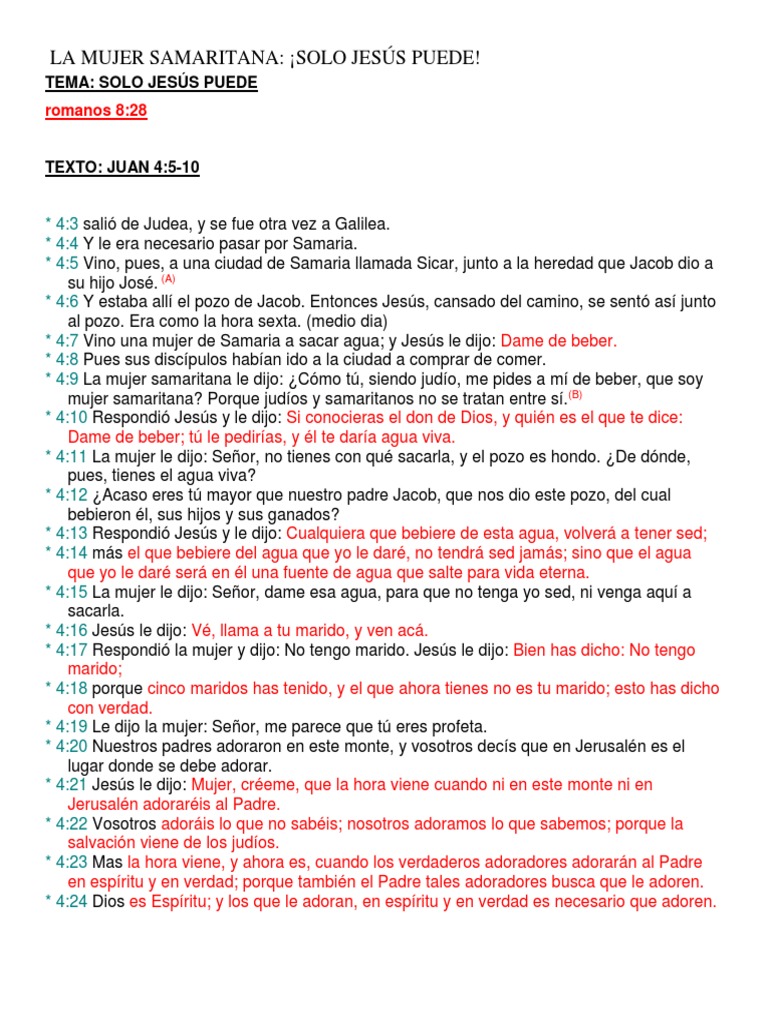 Juan 410 La Mujer Samaritana y cómo la Palabra de Dios muestra nuestro pecado. Publicado el octubre 21 2015 por Pastor Oscar Flores Publicado en Uncategorized Etiquetado BOSQUEJO DE EVANGELISMO GANADORES DE ALMAS GANAR ALMAS LA MUJER SAMARITANA. La mujer samaritana vino al pozo en la hora sexta es decir al medio día normalmente las mujeres venían a sacar agua de los pozos o mas temprano o mas tarde y normalmente el momento de sacar agua era aprovechado por las mujeres para tener contacto social con otras mujeres de la comunidad pero esa mujer seguramente por su presente y por su pasado seria marginada es decir.