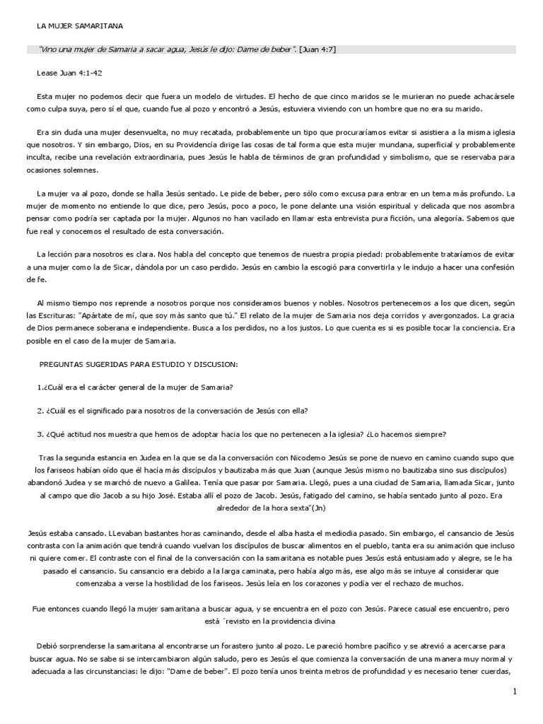 Cómo tú siendo judío me pides a mí de beber que soy mujer samaritana. La mujer Samaritana Texto. El tiene un propósito y es el de enseñarle una lección a la mujer samaritana como lo hace a nosotros en nuestro tiempo.